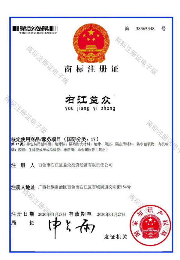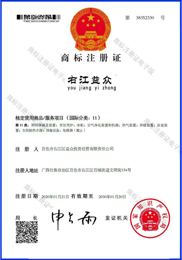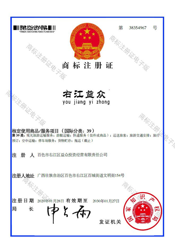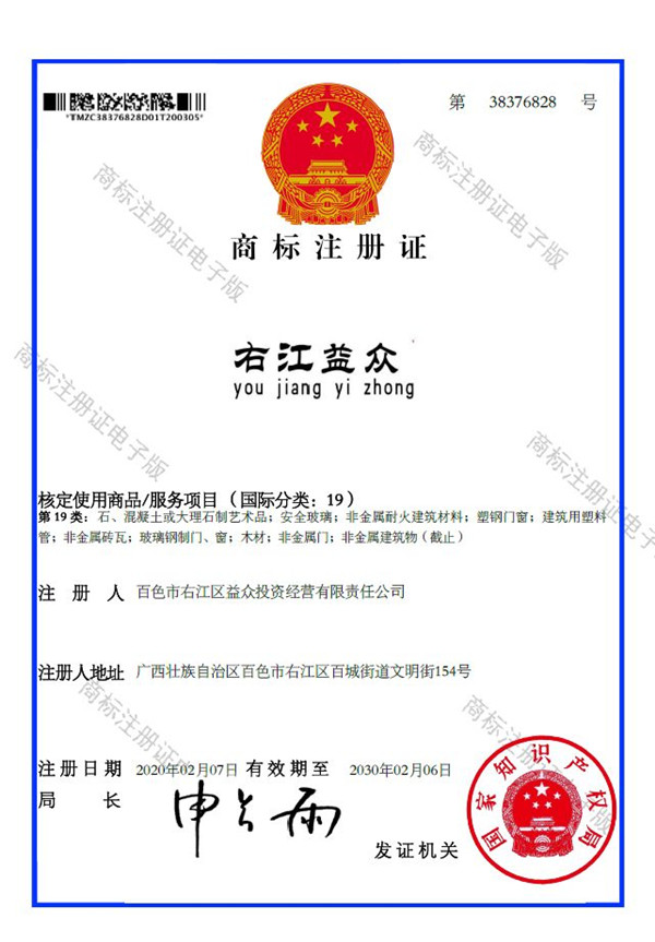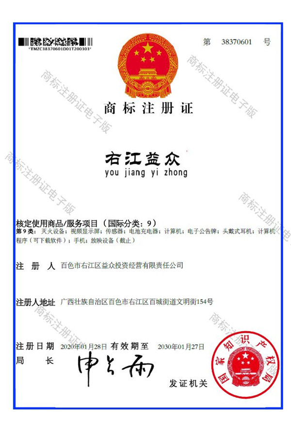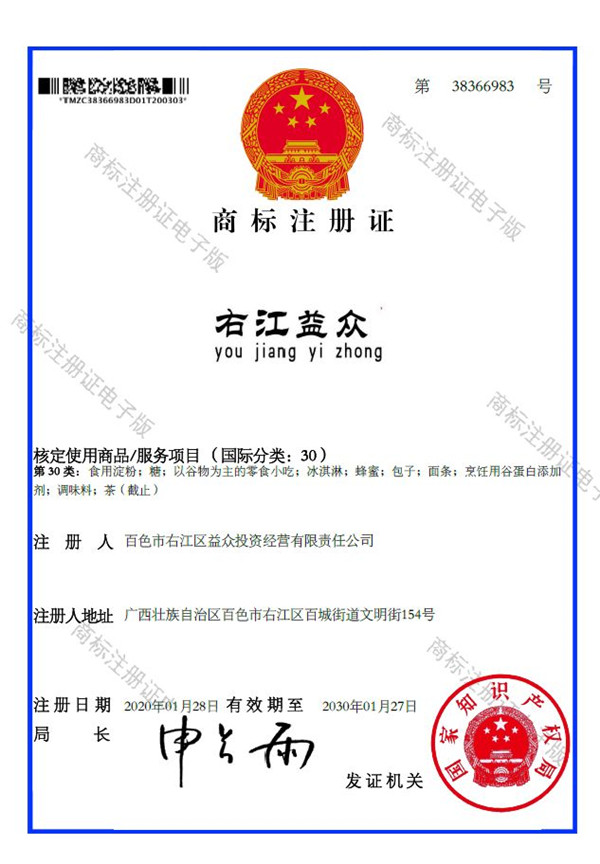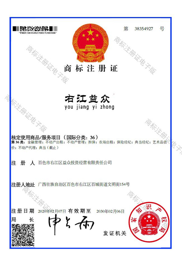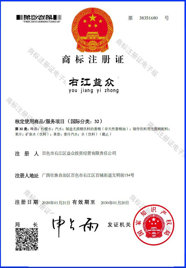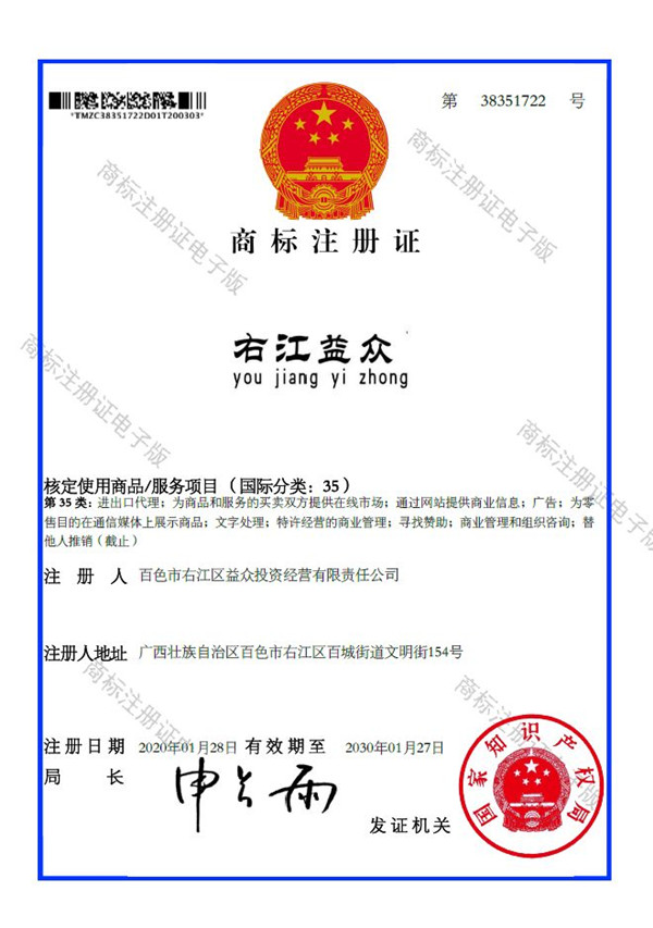 2019年4月,為樹立企業(yè)品牌形象,充分展現(xiàn)品牌價值,廣西百色益眾投資有限公司按照建設(shè)現(xiàn)代企業(yè)的方向和標準,啟動品牌商標注冊申報工作,經(jīng)過6個月的審核期和3個月的公告期,“右江益眾”45個大類商標品牌第一時間成功獲批?!坝医姹姟逼放频某晒ψ?,有利于公司更好地參與市場競爭,同時,對于強化企業(yè)內(nèi)部管理、樹立良好的企業(yè)形象、提升公司美譽度也可起到積極的助推作用。