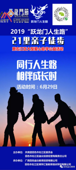 2019年百色市首屆龍門節(jié)暨右江區(qū)大型愛心助學(xué)公益活動第三場—“躍龍門人生路”親子徒步活動將于6月29日舉行,徒步全程10.5公里?;顒幽康氖菫榱烁玫貍鞑ァ凹彝?傳承+親子”的價值理念,以徒步的形式延伸出孩子成長路上的每個階段,徒步的背后蘊(yùn)含著一個永不言棄的家庭奮斗精神?;顒訄竺M(fèi)用50元/家庭(含2家長+1孩子或者1家長+2孩子),所有報名費(fèi)用由共青團(tuán)百色市右江區(qū)委員會捐贈給右江區(qū)建檔立卡的貧困家庭學(xué)生。報名參與長按海報上二維碼識別繳費(fèi)即可,歡迎廣大學(xué)生家長踴躍參與。