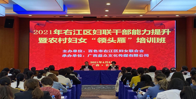 ????????為提高新一屆村(社區(qū))婦聯(lián)主席業(yè)務(wù)水平和履職能力,提升婦女干部的內(nèi)在素質(zhì),盡快進(jìn)入婦聯(lián)工作角色,4月8日至9日,百色市右江區(qū)婦女聯(lián)合會(huì)主辦,廣西益眾文化傳媒有限公司承辦2021年右江區(qū)婦聯(lián)干部能力提升暨農(nóng)村婦女“領(lǐng)頭雁”培訓(xùn)班,來自各鄉(xiāng)鎮(zhèn)(街道)、村(社區(qū))婦聯(lián)主席或負(fù)責(zé)婦聯(lián)工作同志、執(zhí)委等一百多人參加本期培訓(xùn)。