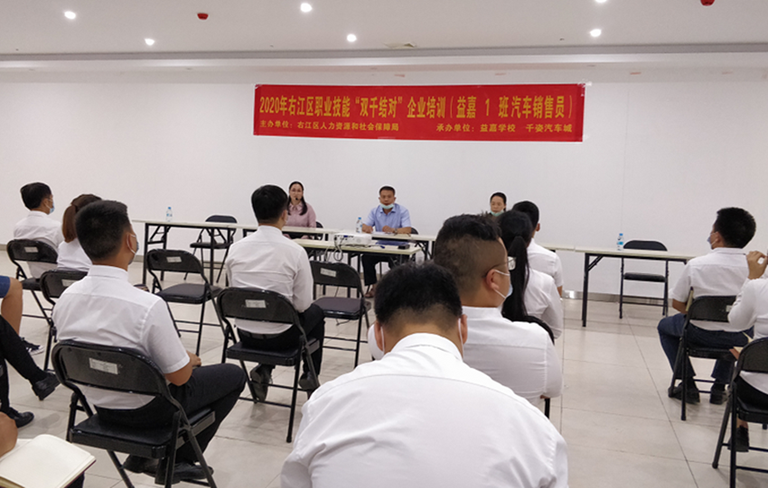 近日,由百色市右江區(qū)人力資源和社會保障局主辦,廣西百色益嘉職業(yè)技能培訓學校、右江區(qū)新姿投資股份有限公司承辦的2020年右江區(qū)職業(yè)技能“雙千結對”企業(yè)培訓(益嘉1班汽車銷售員)在千姿汽車城順利開班,培訓期十天,約50名汽車銷售人員參加培訓。