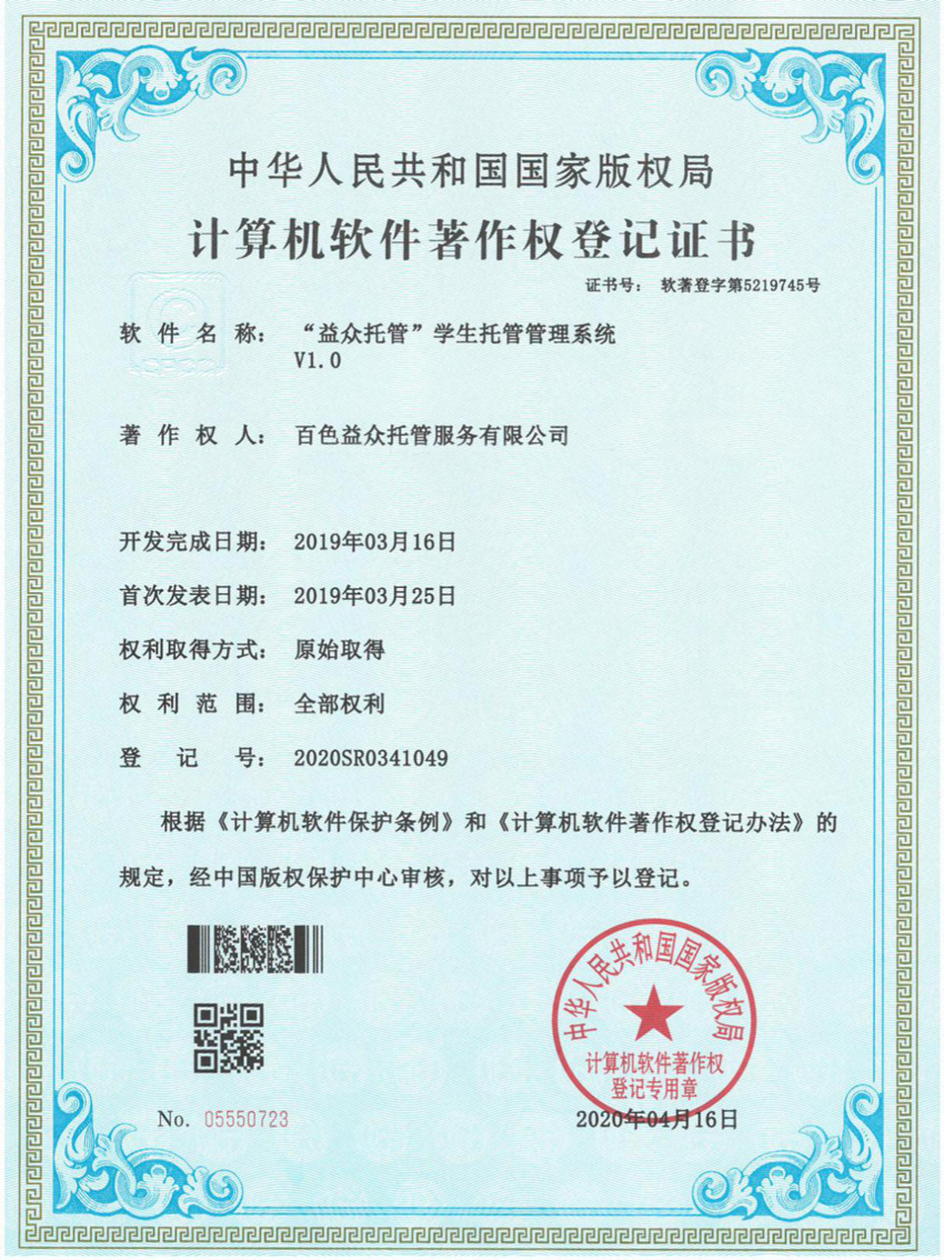 前,經(jīng)中國(guó)版權(quán)保護(hù)中心審核百色益眾托管服務(wù)有限公司提交的“益眾托管學(xué)生托管管理系統(tǒng)符合《計(jì)算機(jī)軟件保護(hù)條例》和《計(jì)算機(jī)軟件著作權(quán)登記辦法》的相關(guān)規(guī)定,被認(rèn)定為原始取得,獲得國(guó)家版權(quán)局頒發(fā)《計(jì)算機(jī)軟件著作權(quán)登記證書》。