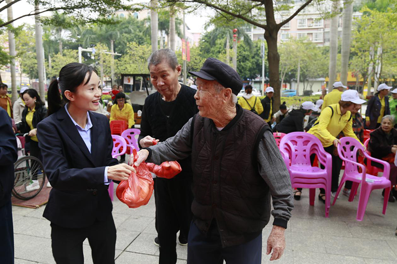 益眾托管公司的志愿者給華宇樂安老人們贈送小禮品