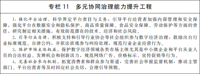 (三)完善多元共治新格局。建立完善政府、平臺(tái)、企業(yè)、行業(yè)組織和社會(huì)公眾多元參與、有效協(xié)同的數(shù)字經(jīng)濟(jì)治理新格局,形成治理合力,鼓勵(lì)良性競(jìng)爭(zhēng),維護(hù)公平有效市場(chǎng)。加快健全市場(chǎng)準(zhǔn)入制度、公平競(jìng)爭(zhēng)審查機(jī)制,完善數(shù)字經(jīng)濟(jì)公平競(jìng)爭(zhēng)監(jiān)管制度,預(yù)防和制止濫用行政權(quán)力排除限制競(jìng)爭(zhēng)。進(jìn)一步明確平臺(tái)企業(yè)主體責(zé)任和義務(wù),推進(jìn)行業(yè)服務(wù)標(biāo)準(zhǔn)建設(shè)和行業(yè)自律,保護(hù)平臺(tái)從業(yè)人員和消費(fèi)者合法權(quán)益。開(kāi)展社會(huì)監(jiān)督、媒體監(jiān)督、公眾監(jiān)督,培育多元治理、協(xié)調(diào)發(fā)展新生態(tài)。鼓勵(lì)建立爭(zhēng)議在線解決機(jī)制和渠道,制定并公示爭(zhēng)議解決規(guī)則。引導(dǎo)社會(huì)各界積極參與推動(dòng)數(shù)字經(jīng)濟(jì)治理,加強(qiáng)和改進(jìn)反壟斷執(zhí)法,暢通多元主體訴求表達(dá)、權(quán)益保障渠道,及時(shí)化解矛盾糾紛,維護(hù)公眾利益和社會(huì)穩(wěn)定。