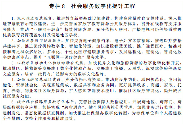 (二)提升社會(huì)服務(wù)數(shù)字化普惠水平。加快推動(dòng)文化教育、醫(yī)療健康、會(huì)展旅游、體育健身等領(lǐng)域公共服務(wù)資源數(shù)字化供給和網(wǎng)絡(luò)化服務(wù),促進(jìn)優(yōu)質(zhì)資源共享復(fù)用。充分運(yùn)用新型數(shù)字技術(shù),強(qiáng)化就業(yè)、養(yǎng)老、兒童福利、托育、家政等民生領(lǐng)域供需對(duì)接,進(jìn)一步優(yōu)化資源配置。發(fā)展智慧廣電網(wǎng)絡(luò),加快推進(jìn)全國(guó)有線電視網(wǎng)絡(luò)整合和升級(jí)改造。深入開(kāi)展電信普遍服務(wù)試點(diǎn),提升農(nóng)村及偏遠(yuǎn)地區(qū)網(wǎng)絡(luò)覆蓋水平。加強(qiáng)面向革命老區(qū)、民族地區(qū)、邊疆地區(qū)、脫貧地區(qū)的遠(yuǎn)程服務(wù),拓展教育、醫(yī)療、社保、對(duì)口幫扶等服務(wù)內(nèi)容,助力基本公共服務(wù)均等化。加強(qiáng)信息無(wú)障礙建設(shè),提升面向特殊群體的數(shù)字化社會(huì)服務(wù)能力。促進(jìn)社會(huì)服務(wù)和數(shù)字平臺(tái)深度融合,探索多領(lǐng)域跨界合作,推動(dòng)醫(yī)養(yǎng)結(jié)合、文教結(jié)合、體醫(yī)結(jié)合、文旅融合。
