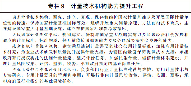 (二十一)加快計量技術機構(gòu)建設。深化計量技術機構(gòu)改革創(chuàng)新發(fā)展,優(yōu)化整合國家計量技術機構(gòu)、區(qū)域國家計量測試中心、地方各級計量技術機構(gòu)和行業(yè)主管部門專業(yè)計量技術機構(gòu)。大力推動國家計量技術機構(gòu)創(chuàng)新發(fā)展,通過組織開展重大測量原理、方法前沿技術攻關,建立量子計量基準并保持國際等效,提供一流的量值溯源和測量服務,支撐國家科技創(chuàng)新、工業(yè)競爭力提升和經(jīng)濟社會發(fā)展。充分發(fā)揮省級人民政府和行業(yè)主管部門計量基礎設施規(guī)劃建設自主權,加強普惠性、基礎性和公益性計量基礎設施建設。提升計量技術機構(gòu)服務市場的能力和水平,推動形成一批專業(yè)領域服務平臺,培育一批專業(yè)化、社會化、網(wǎng)絡化的服務機構(gòu),為經(jīng)濟社會發(fā)展和行業(yè)創(chuàng)新提供計量測試服務。