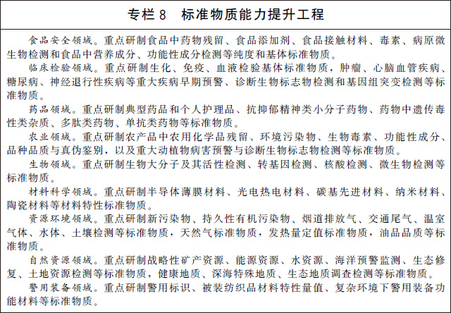 (二十)加大標準物質(zhì)研制應用。建立完善以國家基準物質(zhì)、國家標準物質(zhì)和工作標準物質(zhì)為主要組成部分的標準物質(zhì)體系。實施標準物質(zhì)能力提升工程,加快生命科學、生物醫(yī)藥、環(huán)境監(jiān)測、食品安全、自然資源、刑事司法等重點領域的標準物質(zhì)研制和應用。加強標準物質(zhì)監(jiān)管能力建設和關鍵共性技術研究,提升標準物質(zhì)不確定度水平。探索建立標準物質(zhì)質(zhì)量追溯制度,建設一批標準物質(zhì)量值核查驗證實驗室,建立標準物質(zhì)質(zhì)量追溯平臺,形成研發(fā)、生產(chǎn)、應用全壽命周期的監(jiān)管能力。