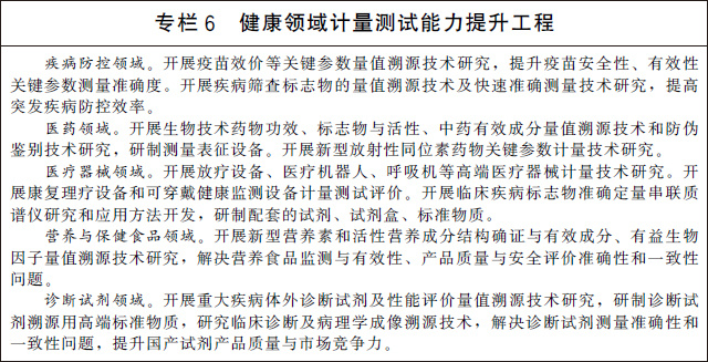 (十五)服務大眾健康與安全。加快醫(yī)療健康領域計量服務體系建設,圍繞疾病防控、生物醫(yī)藥、診斷試劑、高端醫(yī)療器械、康復理療設備、可穿戴設備、營養(yǎng)與保健食品等開展關鍵計量測試技術研究和應用。加強體育設施和器材計量技術研究和測試服務,促進體育產(chǎn)業(yè)高質(zhì)量發(fā)展。完善地質(zhì)和海洋災害、地震、洪澇干旱、森林草原火災等自然災害防御的計量保障體系,提高防災、減災、救災計量能力。加強危險化學品、礦山、建筑施工、地質(zhì)勘查等安全生產(chǎn)相關計量器具的研制生產(chǎn)和監(jiān)督管理。加強公共安全領域計量服務體系建設,開展交通安全、社會穩(wěn)定和安全等領域關鍵計量測試技術研究和應用,推進交通監(jiān)管設備、警用裝備、刑事技術產(chǎn)品等計量測試基礎設施建設。